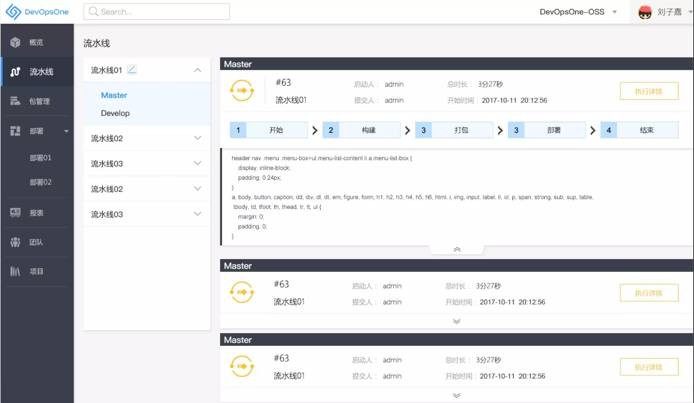 这是平台自定义作业编排的界面,你可以按需编排任务,通过消息触发每个阶段容器化的构建、测试。 报表及统计